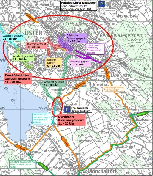 Aufgrund des Anlasses werden Autofahrende angehalten, die Stadt Uster am besagten Tag grossräumig zu umfahren. Zwischen 11 und 18 Uhr ist das Stadtzentrum gänzlich gesperrt. Umzüge und Lieferungen sind nicht möglich. Die Notfallachsen im Stadtgebiet müssen für Rettungskräfte wie Sanität und Feuerwehr frei bleiben. Transitfahrten durch Uster sind während dieser Zeit nicht möglich. Die Umleitungen sind gut signalisiert.