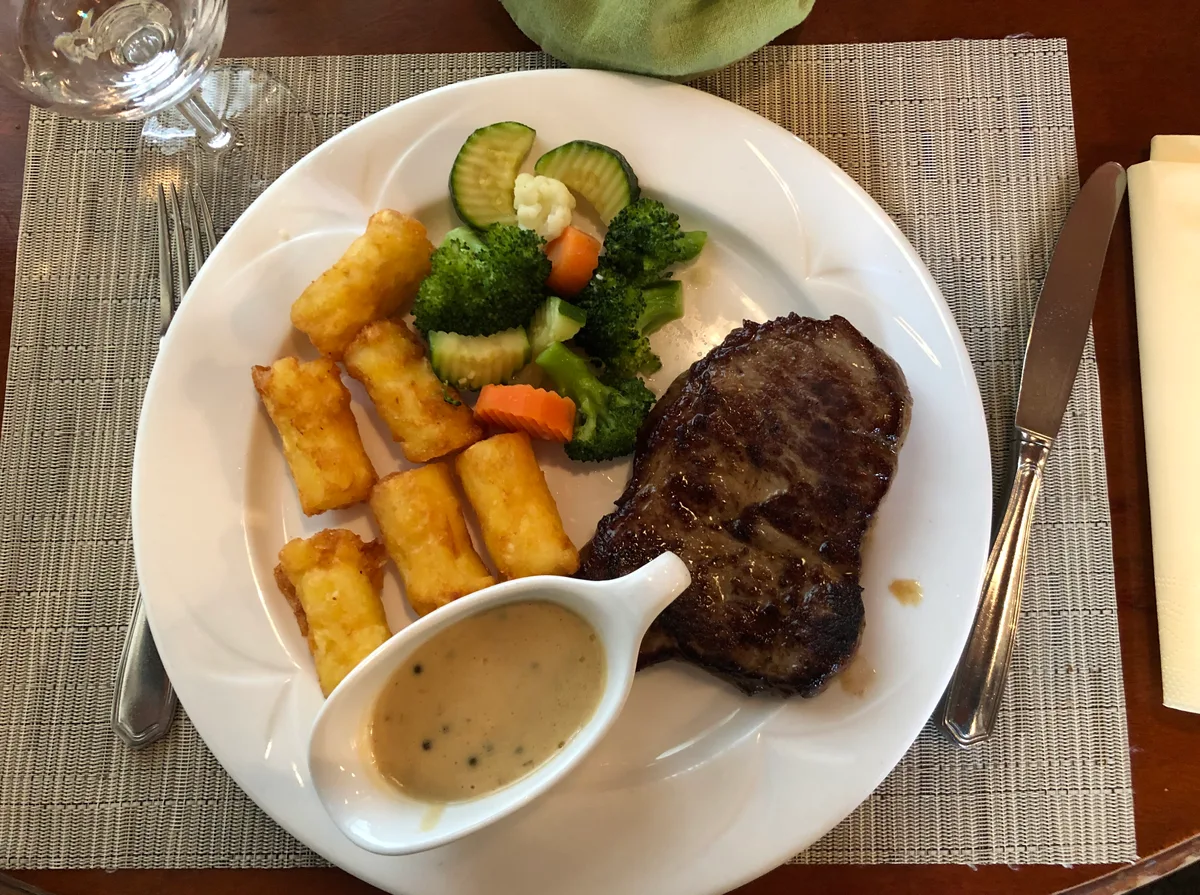 Kurz darauf werden die Hauptgänge serviert. Der Kollege, der das edle Rindsentrecôte aus Südamerika bestellt hat, kommt sogleich ins Schwärmen, als er das grosse Stück Fleisch sieht. Dazu gibt es Röstikroketten, grüne Pfeffersauce sowie Gemüse. Zwar sei er etwas enttäuscht, dass er nur sechs Kroketten auf dem Teller habe, für den Preis von 31.50 Franken für das gesamte Menü könne er aber nicht viel bemängeln. Hunger hatte er nach dem Essen aber trotzdem noch.