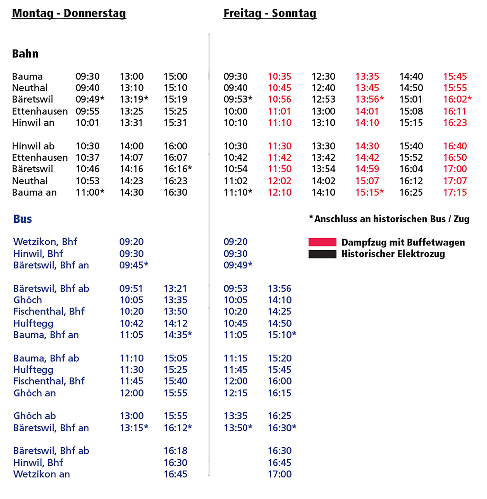 Während sechs Wochen, vom 4. September bis zum 18. Oktober 2020, werden im Zürcher Oberland täglich historische Züge und Busse entsprechend eines ausgeklügelten Fahrplans verkehren. Diese Fahrten werden grob gesagt im Raum zwischen Wetzikon und der sich im Kanton St. Gallen befindenden Hulftegg stattfinden.