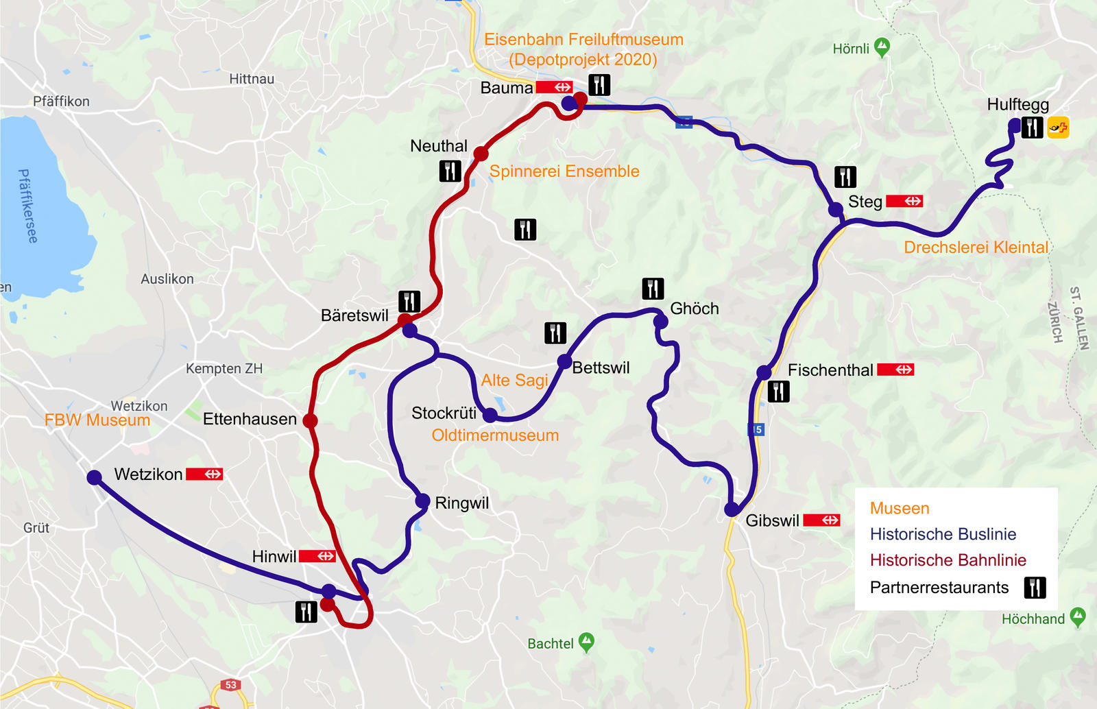 Die Postautos fahren neben den Haltestationen der Dampfbahn die Orte Wetzikon, Ringwil, Bettswil, Gibswil, Fischenthal und Steg (mit Abstecher auf die Hulftegg) an. Haltestellen wird es an diversen Partnerrestaurants sowie an verschiedenen musealen Orten wie der Wasserrad-Sagi Stockrüti, dem Oldtimermuseum Junod in Bäretswil oder bei der Drechslerei Kleintal bei Steg geben. Die Betreiber der Museen sind übereingekommen, ihre Häuser während jeweils zwei Tagen in der Woche zu öffnen.
