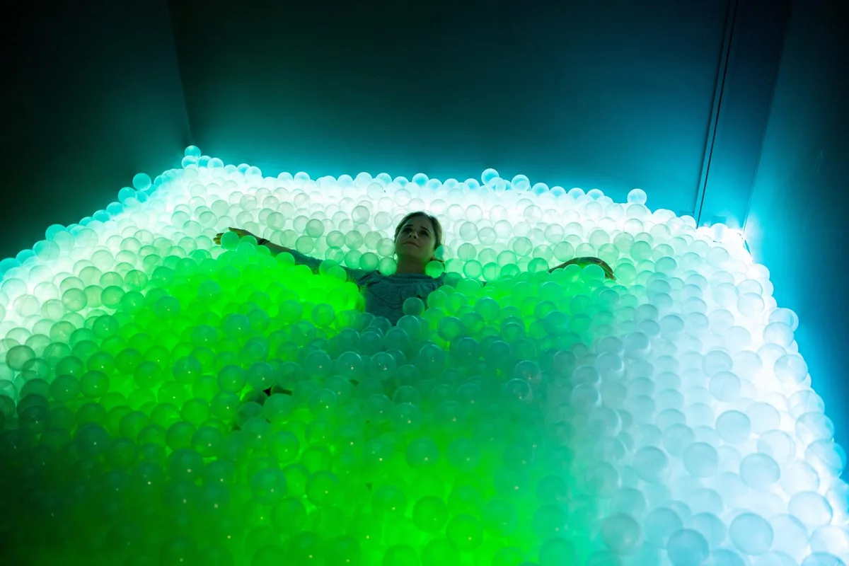 Am Schluss gehe ich in den Floating-Raum. Dieser gefällt mir am besten. Das Licht ist bläulich schummrig, wie in einem Wellness-Raum. Hier kann man sich in die Bälle legen und die Augen von der Überreizung der anderen Stationen erholen. Diesen Raum würde ich aber nur ungern mit Fremden teilen. Zum Glück darf ich alleine vortesten.
