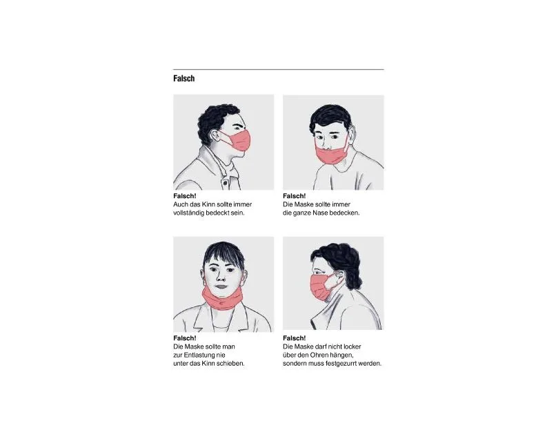 Den meisten Menschen wird das Tragen der Maske schnell unangenehm. Sie beginnen dann, daran herumzuzupfen und sie hoch- oder runterzuziehen. Das sollte man keinesfalls tun. Wenn man sich dazu entschliesst, eine Maske zu tragen, sollte man sie nicht anfassen. Wer die Maske immer wieder an- und auszieht, ohne sich vorher die Hände zu desinfizieren, kann genauso gut keine tragen. Diszipliniert zu bleiben, ist nicht einfach. Korrekt angewendet, können Masken aus Sicht verschiedener Experten aber eine wichtige Rolle bei der Eindämmung spielen.