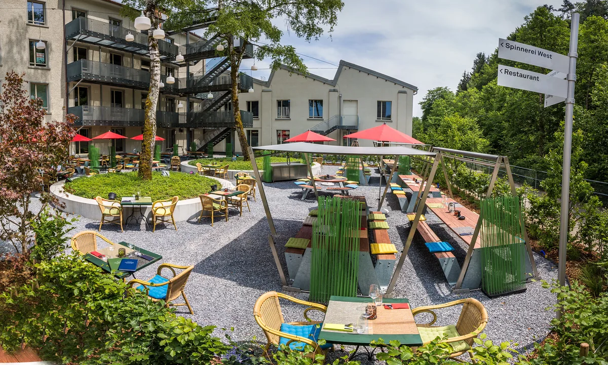 An einem schönen Sommertag könnte man fast vergessen, dass man sich auf einem ehemaligen Industrieareal befindet. Im Hinterhof der ehemaligen Spinnereigebäude in Aathal lädt das Restaurant Neue Spinnerei zum Verweilen ein. Das Wasser plätschert in der Aa, die Sonne scheint und das Zwitschern der Vögel ist zu hören. Eine idyllische Szenerie im Grünen. Gleichzeitig ist dank der historischen Gebäude – und nicht zuletzt dank des hochragenden Industriekamins – die Geschichtsträchtigkeit des Ortes spürbar.