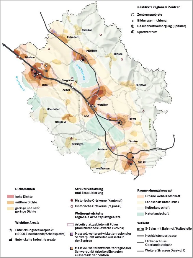 Das Oberland im 2040 wird ein anderes sein als heute: Die kantonalen Planer rechnen bis dahin mit einer Zunahme von rund 36‘000 Einwohnern. Das entspricht einem satten Plus von 24 Prozent. Heute zählt die Agglomeration « Zürcher Oberland » , die 15 Gemeinden mit den Zentren Uster, Wetzikon, Pfäffikon, Hinwil und Rüti umfasst, 149‘000 Einwohner. Drei Viertel der Bevölkerung leben in den Gemeinden entlang der S-Bahn-Achsen.