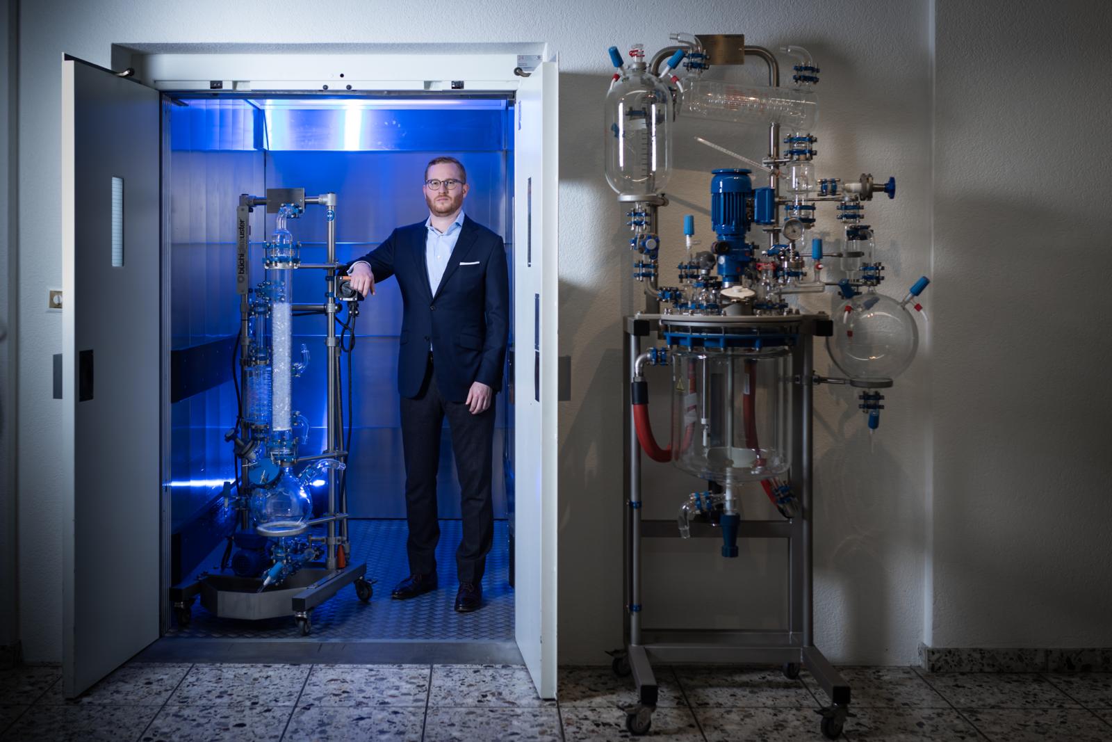 Büchiglas stellt Reaktorsysteme und Pilotanlagen für die chemische und pharmazeutische Industrie sowie für Forschungseinrichtungen her. In ihren komplizierten Gerätschaften aus Glas, Emaille und Metall entstehen dann unter anderem Pharma-Wirkstoffe. Büchi führt das Familienunternehmen seit 2016 in der dritten Generation.